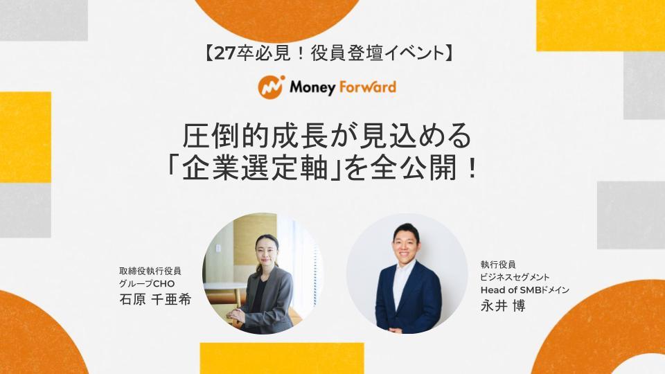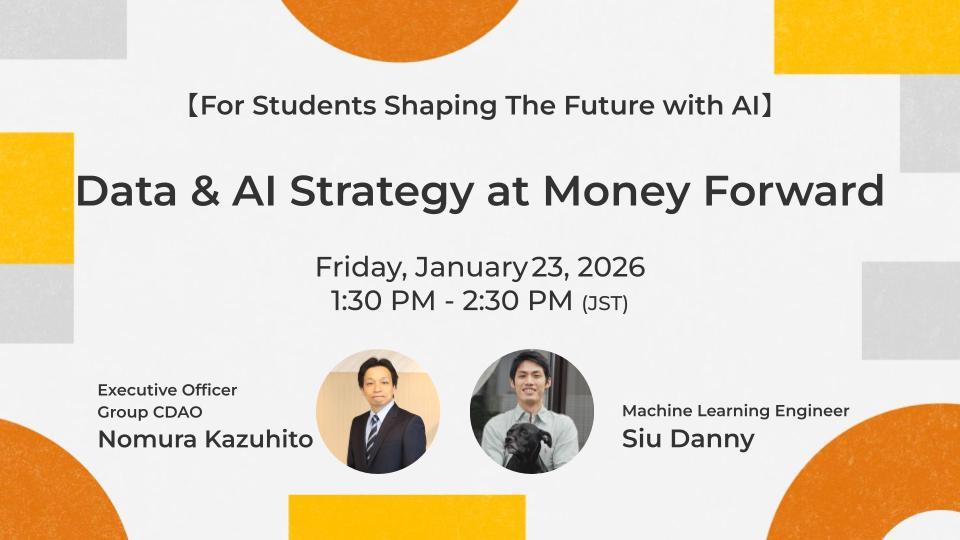 2027年新卒採用 ビジネス職本選考エントリー ■ 2027年卒 ビジネス職本選考について ■株式会社マネーフォワードは、「お金を前へ。人生をもっと前へ。」をミッションに掲げ、すべての人の"お金の課題解決"に挑んでいます。家計簿・資産管理アプリ「マネーフォワード ME」は1,600万人超、法人向けサービスも35万社以上に利用され、日本No.1の「お金のプラットフォーム」へ成長しています。(2024年11月末時点)私たちが目指すのはその先です。テクノロジーの力で「誰もがお金にポジティブになれる社会」をつくり、日本経済そのものを前に進める存在になること。中小企業の生産性向上から、個人が抱える将来への不… [more] 職種ビジネス 勤務地東京 27卒 エントリー 【27卒必見!】役員が語る、"新卒カード"をどこで切るか? 圧倒的成長が見込める「企業選定軸」を全公開! 当社の取締役執行役員グループCHO(最高人事責任者)石原と執行役員永井が登壇する特別イベントです!本イベントでは、役員の視点から「社会の変化に対応できる企業か」「どんな企業が今後伸びそうか」など、企業を見る際の【本質的なポイント】を解説します。まさに今「どの企業を受けるべきか」そして「どの企業に入社をするか」考える方にとって、入社すべき企業の選び方の答えが出るイベントです。成長環境を求め、就職活動を進めている方、「とりあえずエントリーしたけど、本当にこの会社で成長できるのか?」「”働きやすそう”な会社ではなく、”成長できる”会社を選びたい」「でも、企業が言う”成長環境”が本物か… [more] 職種ビジネス イベント 27卒 エントリー 2027年新卒採用 エンジニア職 本選考直結就業型インターン 【Spring】/ Engineering Spring Internship ~ English information is provided after Japanese ~◼️マネーフォワードについて株式会社マネーフォワードは、サービスや事業を通じて、世の中からお金に関する悩みや課題をなくし、人々の生活や企業を飛躍的に豊かにすることで、チャレンジできる社会をつくりたいと考えています。2012年の創業以来、多様なユーザー(企業、個人事業主、個人)に向けて、個人向けのお金の見える化サービス『マネーフォワード ME』やビジネス向けのバックオフィスSaaS『マネーフォワード … [more] 職種エンジニア 27卒 エントリー 2027年新卒採用 Webアプリ開発エンジニア職 本選考エントリー / 2027 New Graduate: Web Application Development Engineer 株式会社マネーフォワードは、サービスや事業を通じて、世の中からお金に関する悩みや課題をなくし、人々の生活や企業を飛躍的に豊かにすることで、チャレンジできる社会をつくりたいと考えています。2012年の創業以来、多様なユーザー(企業、個人事業主、個人)に向けて、ビジネス向けのバックオフィスSaaS『マネーフォワード クラウド』や個人向けのお金の見える化サービス『マネーフォワード ME』を始めとした、60を超えるサービスをリリースしてまいりました。しかし、すべてのユーザーのお金の課題を解決するオープンで公正なプラットフォームの実現には、乗り越えるべき壁はまだ多く存在し、さらな… [more] 職種エンジニア 27卒 エントリー 2027年新卒採用 機械学習・AIエンジニア職 / 2027 New Graduate: Machine Learning/AI Engineer マネーフォワードでは、AIのプロフェッショナルからなるAI推進室を設置しています。様々な領域におけるAIシステムの導入・研究・推進・開発・実装をサポートし、マネーフォワードの各部門に対しての支援をおこなっています。AI推進室内の技術部門では、機械学習を活用したプロダクトの強化や新サービスの開発をチームと協働して行うML/AIエンジニアを募集しています。ML/AIエンジニアとして、チームの一員となってユーザー体験を向上させるML技術の統合と最適化を支援し、マネーフォワードの長期的な成功の中心となるサービスに貢献していただきたいと考えております。AI開発部に参画いただく魅力として、優… [more] 職種エンジニア 27卒 エントリー 【Event】Data & AI Strategy at Money Forward Get the inside scoop on real world AI strategy and development from the leaders driving innovation at Money Forward, one of Japan's top Fintech companies. Hear from … [more] 職種エンジニア イベント 27卒 申 込 2027年新卒採用 研究開発職 本選考エントリー Money Forward Labはテクノロジーとデータを駆使し、未来を可視化することで、すべてのユーザーのお金に対する漠然とした不安や課題を解決すべく、2019年3月1日に設立しました。 研究の方向性は専門領域によって多岐に渡りますが、とりわけ注力している領域は企業のバックオフィスを自律化する「Autonomous BackOffice」(オートノマス・バックオフィス)の研究開発です。Autonomous(自律化)は、自動車に例えると、人が設定した目的地まで人の運転操作を不要とする自動運転のさらに先にある「自律運転」です。自律運転の場合は、周辺情報か… [more] 職種エンジニア 27卒 エントリー 2027年新卒採用 デザイナー職ベーシックコース 本選考エントリー 〜CDO(Chie